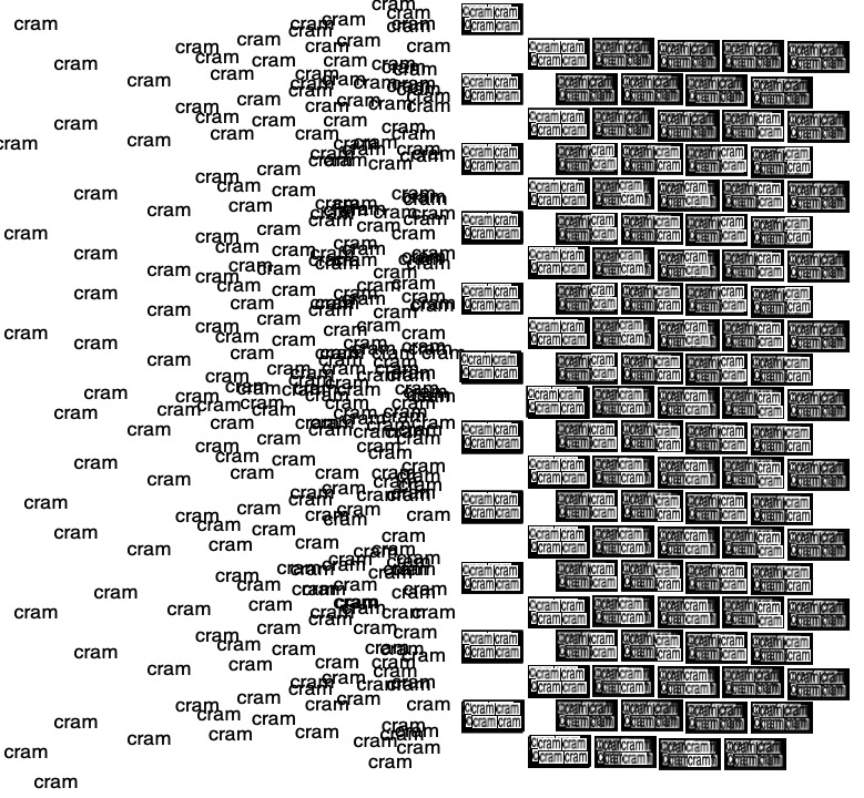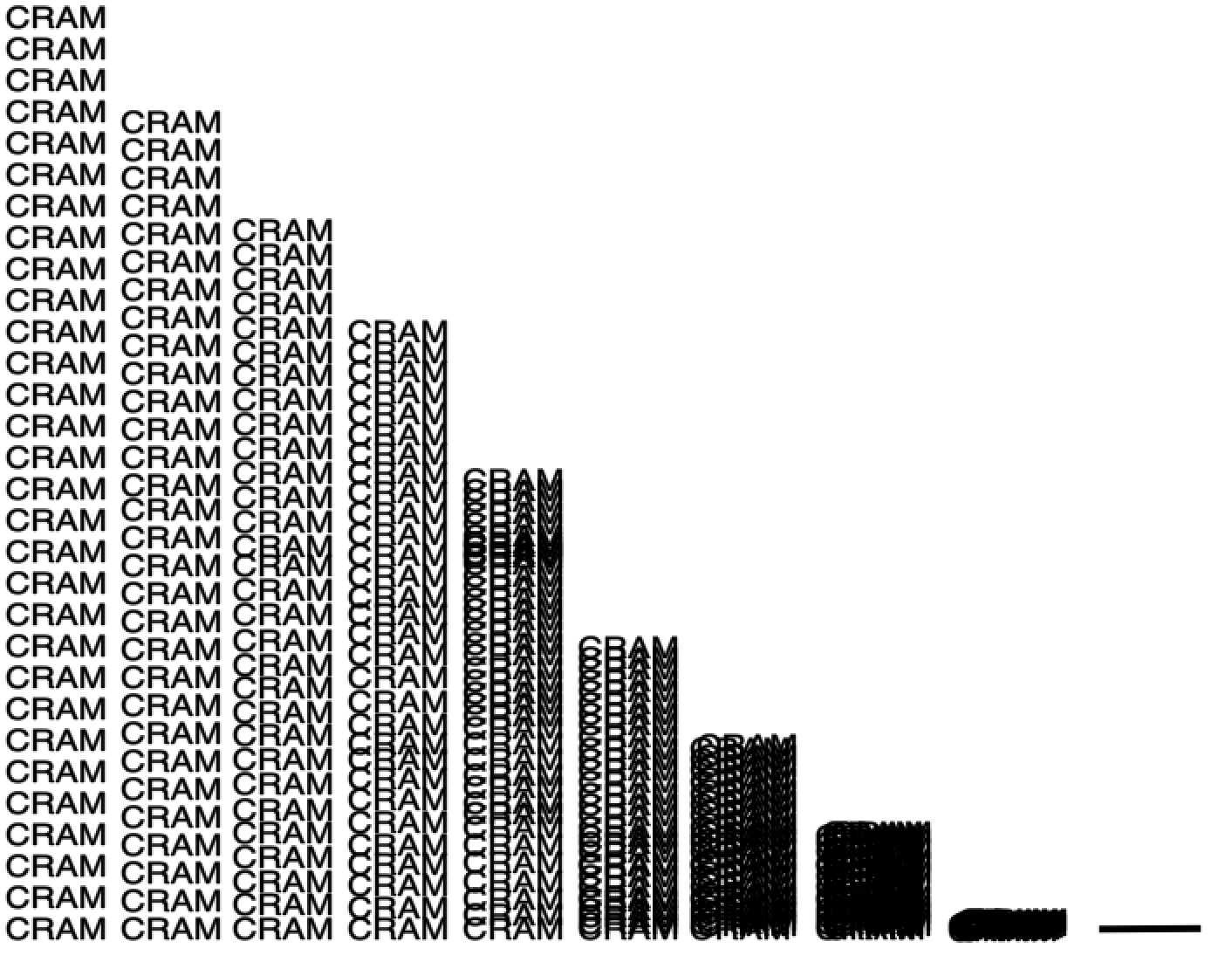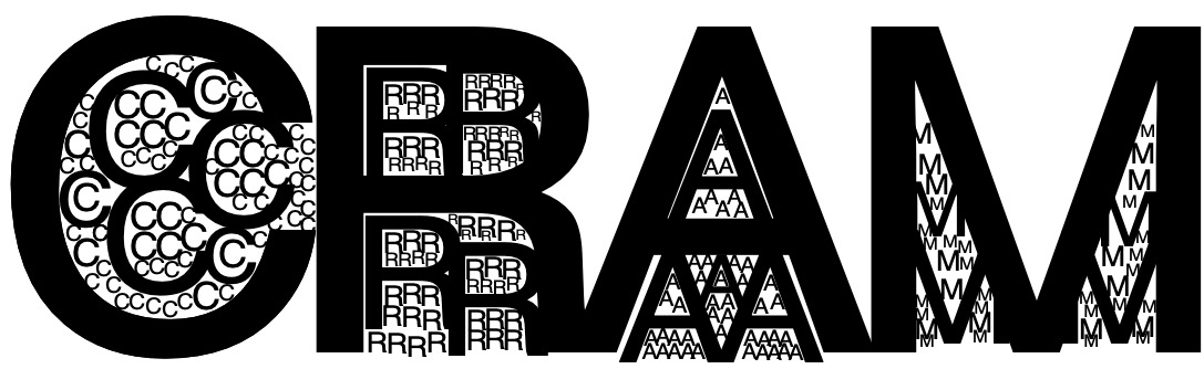 I picked up the third segment and on it I wrote the word “cram” except this time in large block letters. Then I filled in the white space within the C with smaller letter c’s and did that again, making the letters yet smaller, until I had a densely c-packed C. Then repeated the process with the other three letters.